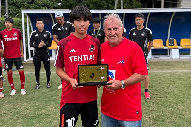 試合後選手たちは、ジーコ氏から「この大会から多くのJリーガーが誕生した。みんなの中からもきっとプロの選手になって活躍する人たちが出てくるはず」という激励の言葉と、大会参加記念盾を受け取りました。