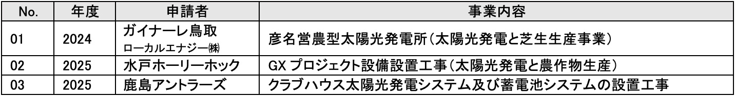 「Jリーグ地域再生可能エネルギー助成制度」は、「地域の自然資源を活用した再生可能エネルギー普及および、地域内循環促進のための発電設備の新設および拡張等のプロジェクト」ならびに、「新たな自然破壊につながらない再生可能エネルギーの可能性」を発信していくプロジェクトを対象とし、これまでに、今回受賞した2クラブのソーラーシェアリング事業を含めた、3つの事業を対象に助成を行っています。