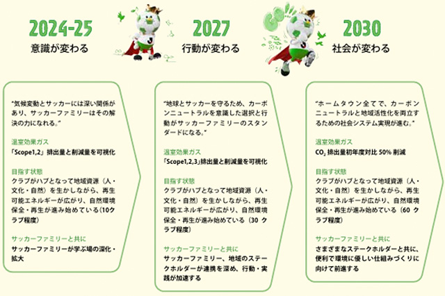Jリーグでは、気候変動による地球温暖化や災害の激甚化などを受けて、サッカーができる環境を守るために、気候アクションが不可欠なものと考え、「気候アクションロードマップ」を2024年に定めました。サッカーが持つ力を生かし、サッカーファミリーと共に、社会に対してポジティブな影響を生み出すことが重要だと考えています。