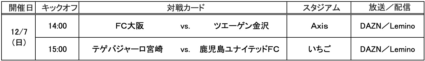 本大会は、2025明治安田J3リーグ年間順位3位~6位のチームで各1試合のトーナメントを行い、優勝したクラブがJ2に昇格できるものです。準決勝に出場するのは、FC大阪(2025明治安田J3リーグ3位)、テゲバジャーロ宮崎(同4位)、鹿児島ユナイテッドFC(同5位)、ツエーゲン金沢(同6位)の4チームです。