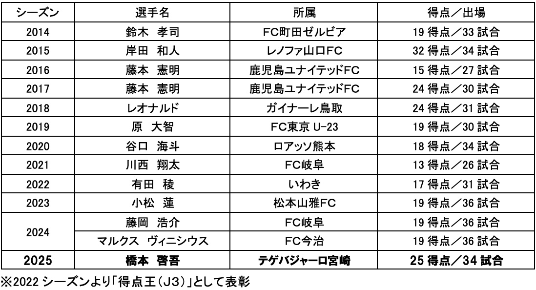 なお、得点王の表彰は、12月24日(水)にオンラインで配信される「2025J3リーグアウォーズ」にて行います。