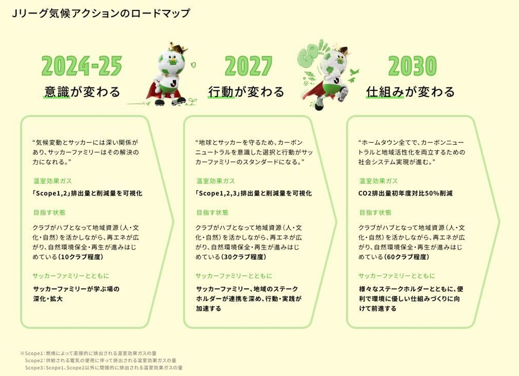 Jリーグは、サステナビリティの活動領域をPEOPLE(インクルーシブな社会へ)、PLANET(気候アクション)、COMMUNITY(地域コミュニティの醸成)の3つと定義していますが、昨今の気候変動による温暖化や災害の激甚化を受けて、次世代にスポーツができる環境をつないでいくことが喫緊の課題であると、2023年に気候アクショングループを立ち上げ。ロードマップを策定し、各種気候アクションを推進してきました。