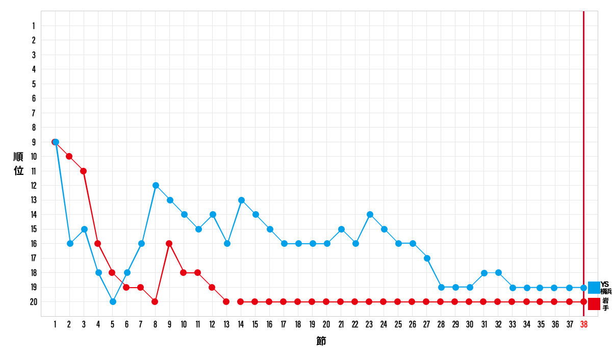 | 20 | 岩手 | 22 | -53 | 10月27日 (日) vs 大宮 ● 1-2 | 11月3日 (日) vs 金沢 △ 1-1 | 11月9日 (土) vs 松本 ● 1-6 | 11月17日 (日) vs 奈良 ● 0-1 | 11月24日 (日) vs 福島 ● 1-4 |