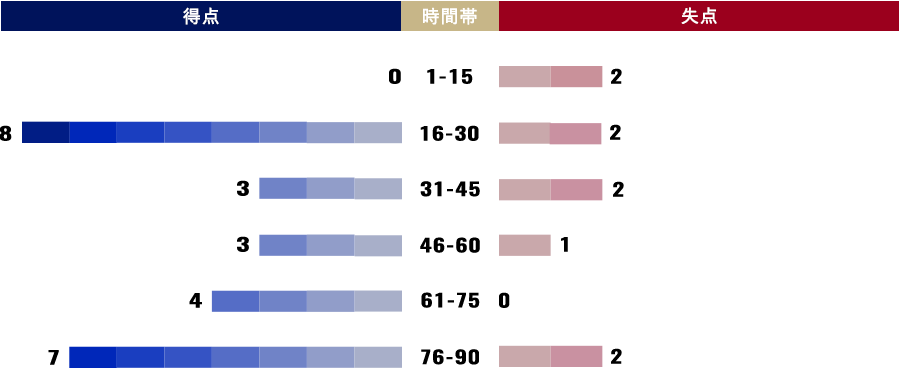 なお、前半アディショナルタイムの得点・失点は「31-45」に、後半アディショナルタイムの得点・失点は「76-90」に分類されています。