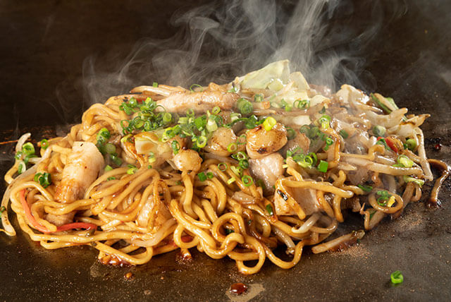 ご当地B級グルメを代表する『富士宮やきそば』。コシの強い麺に、豚の『肉カス』を加え、仕上げにイワシの『だし粉』を振りかけた逸品。正規公認店の味を、焼きたてアツアツでご提供いたします。